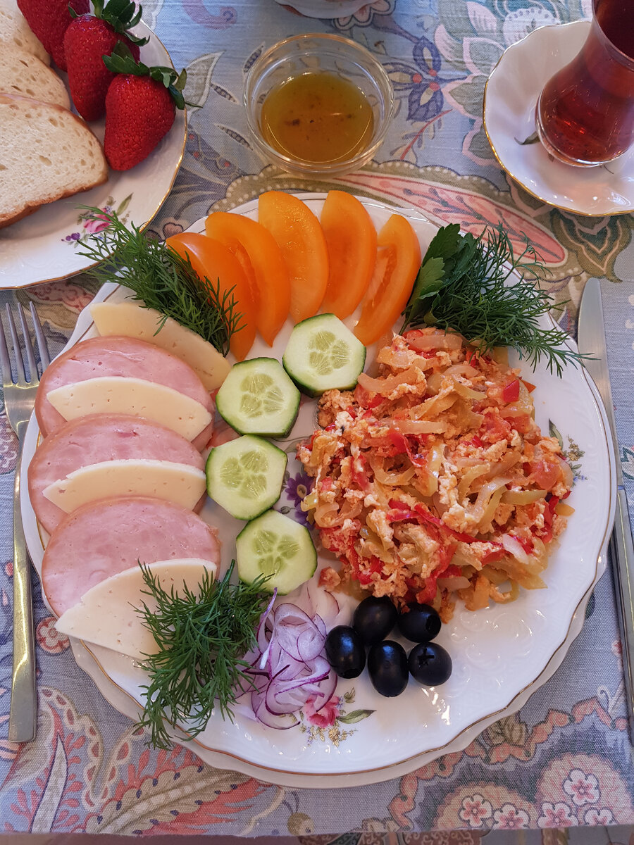 На тарелке красиво разместите порезанные помидоры, огурец, ветчину и сыр. Украсив блюдо зеленью, добавьте менемен и полейте его соусом. Такой завтрак отлично подается с ароматным турецким чаем и свежими ягодами, сообщает Дзен-канал "Ольга Викторовна".