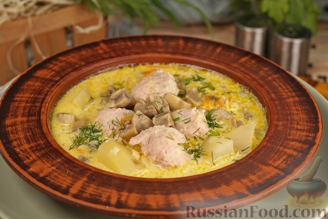 1. Сырный суп с фрикадельками - этот суп, приготовленный на основе куриного фарша и булгура, отличается насыщенным вкусом. Фрикадельки обжариваются отдельно, что позволяет им сохранить форму и аромат. Шампиньоны добавляют интересный оттенок, а плавленый сыр делает суп особенно сливочным.