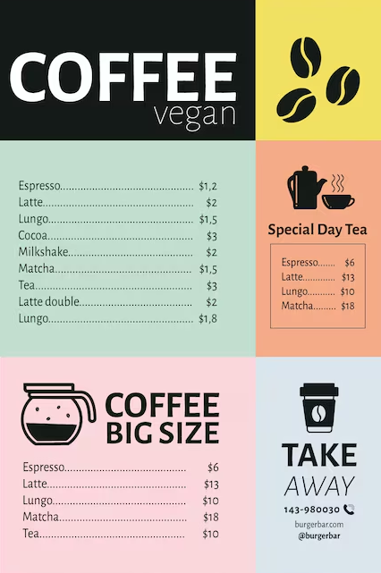 Формат меню зависит от концепции кофейни: если вы предлагаете самообслуживание, подойдет доска, в противном случае — печатное или электронное меню. При выборе дизайна учитывайте: