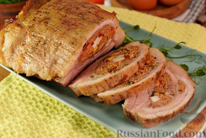 - Мясной карман: Фаршированная свиная грудинка — центральное блюдо, которое станет настоящим украшением стола.