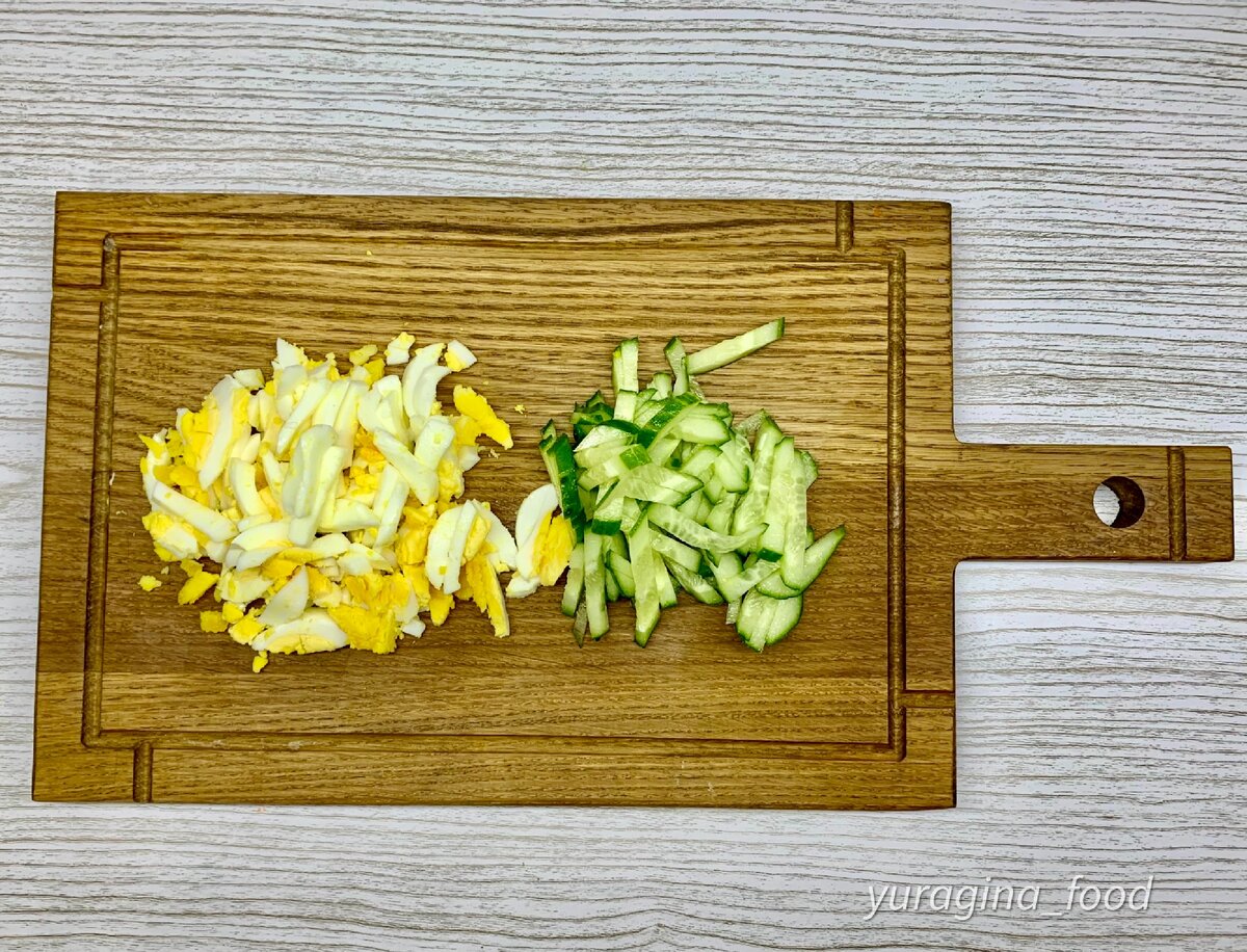 Первый шаг — сварить яйца вкрутую, затем дать им остыть, очистить и нарезать соломкой. Свежий огурец обрабатывается аналогично.