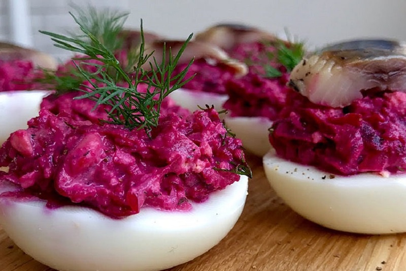Можно использовать и альтернативный вариант сборки: в этом случае свекла дополняется только зеленью с чесноком, а остальные ингредиенты перемешиваются в отдельной посуде с майонезом. Начинку сначала помещают в половинки желтков, затем накрывают свекольным слоем, укладывают сверху ломтики сельди с зеленью.