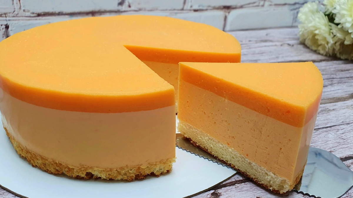 На дно формы диаметром 16 см уложить бисквит, по желанию пропитать его соком. Сверху вылить тыквенно-апельсиновую массу и охладить в холодильнике на 1 час до застывания.