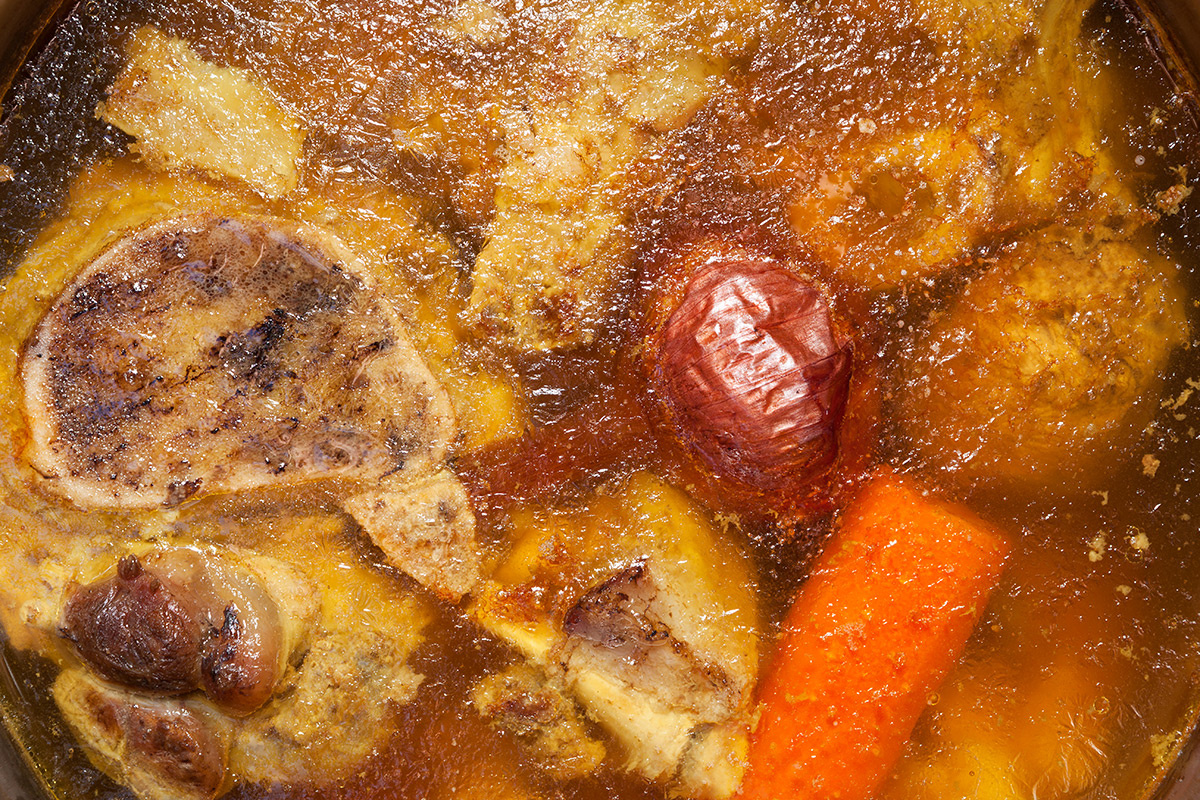 Для создания идеального холодца не требуется никаких добавок, лишь мясо и бульон, приготовленный на основе костей и хрящей. По сути, это реальный коллаген, который застывает в результате остывания. Процесс этот требует не только времени, но и умения: бульон варится медленно — от 6 до 7 часов. Необходимо следить, чтобы он не бурлил, а лишь слегка покачивался, чтобы добиться нужной прозрачности.