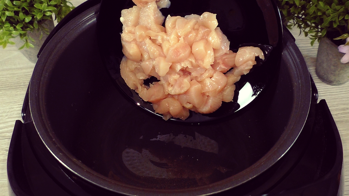 1. Для начала куриное мясо следует нарезать и обжарить в мультиварке с небольшим количеством масла до изменения цвета, используя режим «жарка».