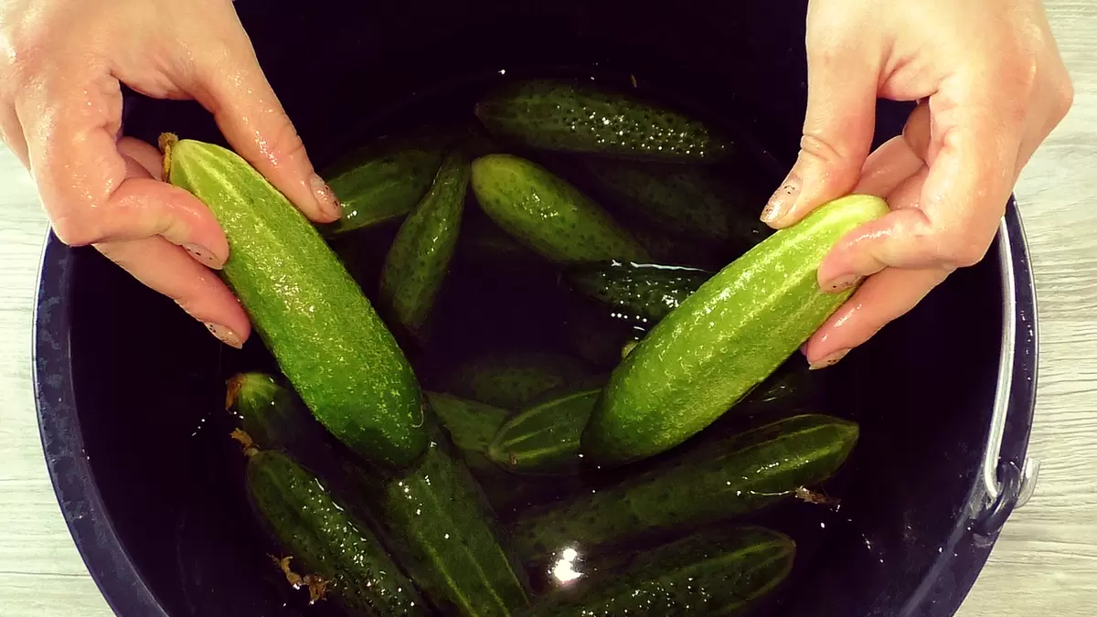 1. Прежде всего, огурцы следует замочить в холодной воде минимум на 30 минут. Это улучшает текстуру плодов и помогает сохранить их хрустящими.