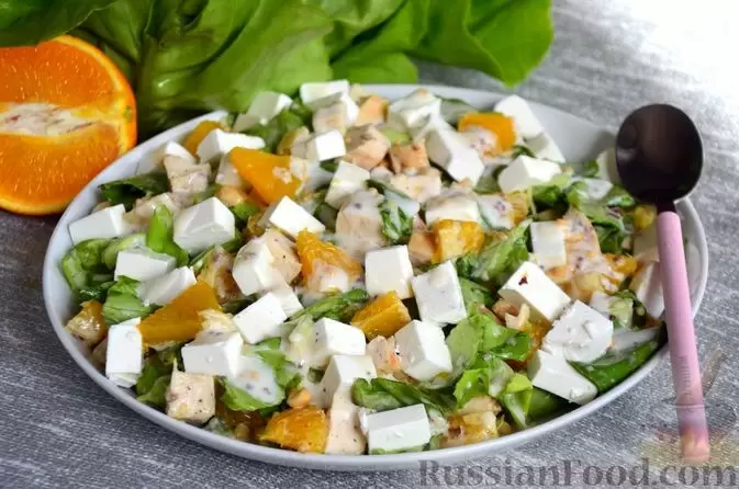 - Салат с курицей, апельсином и фетой: Легкий и освежающий, этот салат станет спортивной победой на любом застолье. Нежное куриное филе в сочетании с сладкими дольками апельсина и пикантной фетой создаст гармоничный вкус, который не оставит равнодушным никого.