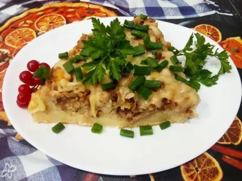 Готовый пирог нарезают на порции и подают с любимым соусом. Это блюдо станет прекрасным угощением как для семейного ужина, так и для праздничного стола.