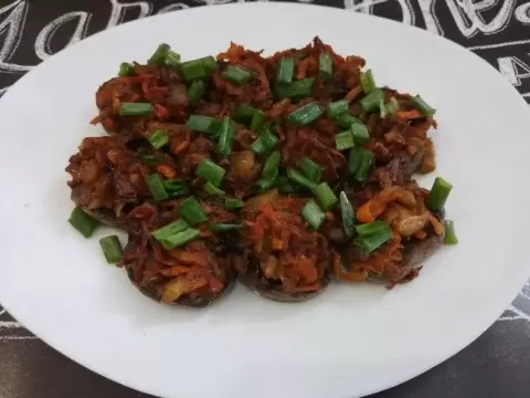 3. **Запекание:** Разогреть духовку до 180°C. Противень смазать растительным маслом, заполнить грибные шапочки начинкой и разместить их на противне. Запекать в духовке до 40 минут, пока вся жидкость не испарится. Готовые грибы можно украсить нарезанным зелёным луком перед подачей на стол.