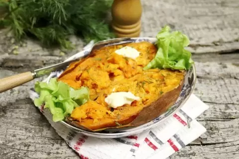 После выпекания фольгу разворачивают и разрезают батат пополам. С помощью вилки мякоть взбивают, добавляют соль, перец и кусочки сливочного масла. По желанию можно присыпать зеленью – так блюдо станет еще более аппетитным.