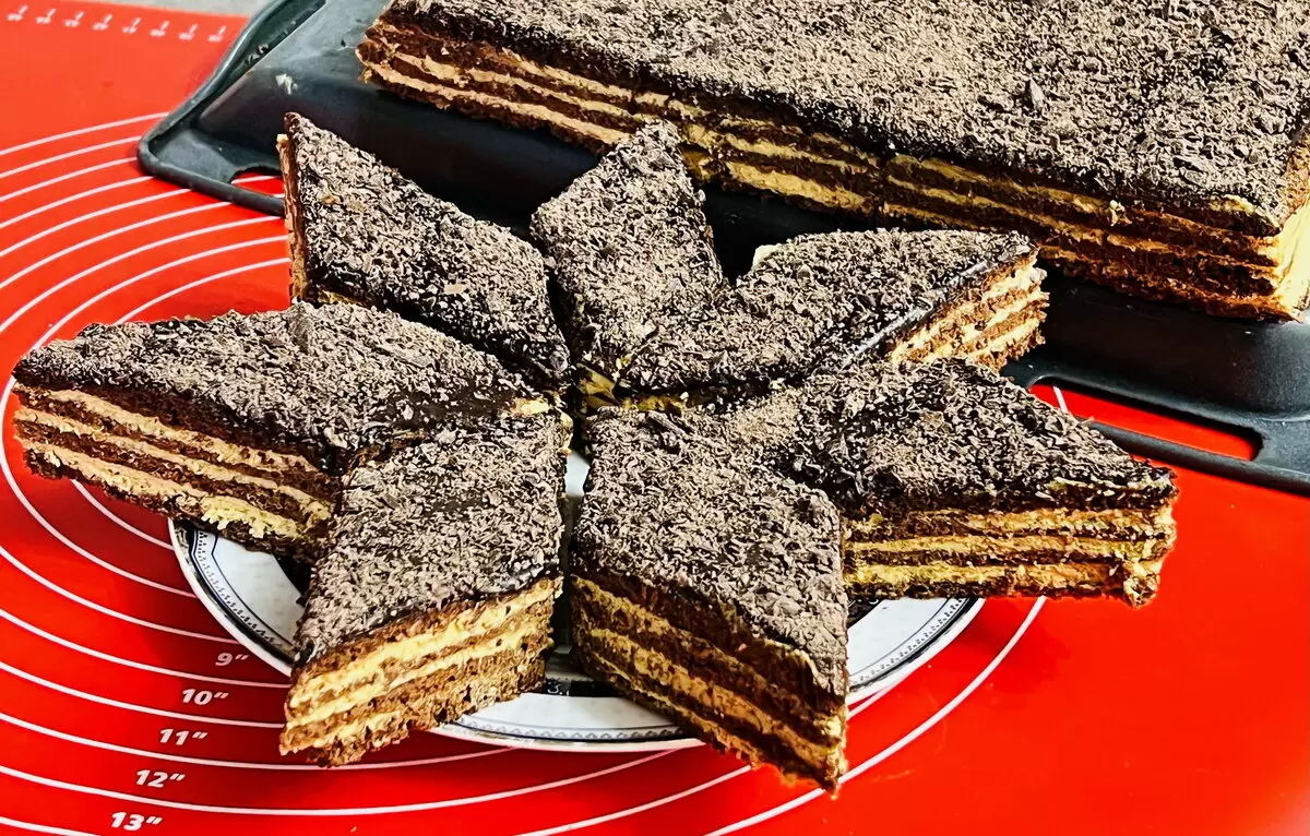 После того как коржи остынут, наступает время для создания восхитительного крема, который станет ключевым моментом торта. В его состав входят вареная сгущенка, сливки, кофе и коньяк, что придает крему уникальный, неповторимый вкус. Все коржи щедро смазываются кремом, а в завершение торт покрывается шоколадным ганашем, традиционно декорируется шоколадной крошкой и отправляется в холодильник для пропитки.