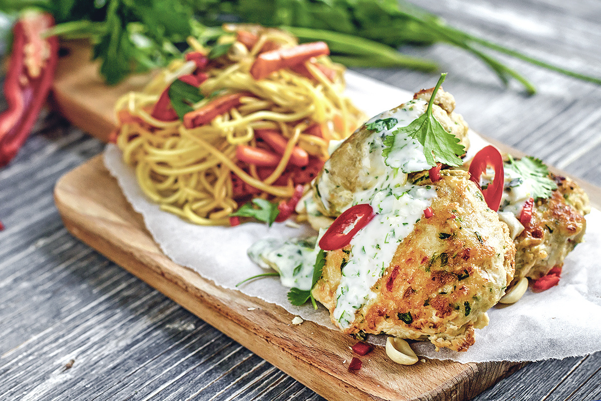 На сервировочные тарелки выложить фишкейки и яичную лапшу, полить ароматным соусом и подавать к столу. Приятного аппетита!