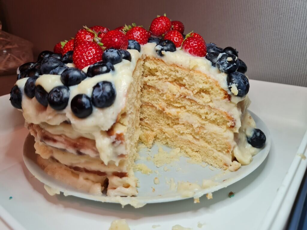 Украсив верх торта ягодами, поставьте его в холодильник на ночь для пропитки.