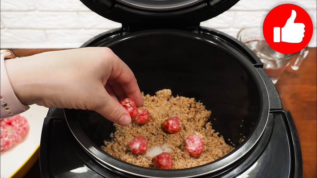 В чашу мультиварки помещается предварительно промытая пшеничная крупа. Затем добавляется соль, холодная вода и подготовленные фрикадельки. Блюдо готовится на режиме «мультиповар» при температуре 110°C в течение 30 минут, а также возможно использование режима «рис/крупы» на тот же срок.