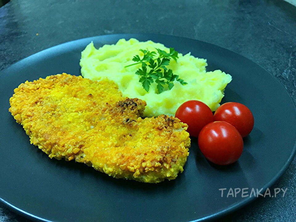 Как обычно, сначала отбивают мясо, хорошо солят и перчат, а затем наступает важный момент — панировка. Вместо муки и яиц можно взять кукурузные хлопья без добавок — они придадут мясу не только уникальную хрустящую корочку, но и солнечный цвет.