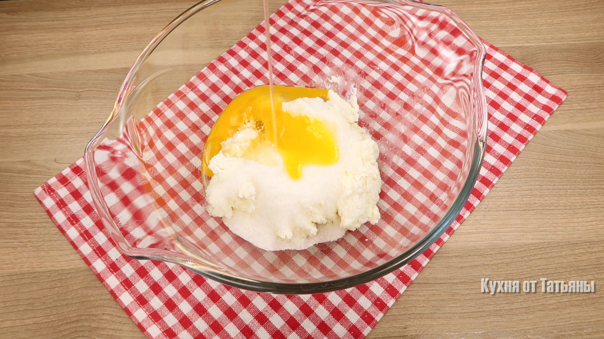Для начала, все ингредиенты желательно заранее достать из холодильника, чтобы они стали комнатной температуры. В подходящую чашу отправляется творог, за которым следуют соль, обычный сахар и ванильный сахар. Затем добавляется нейтральное растительное масло, одно яйцо и, в самом конце, сметана.