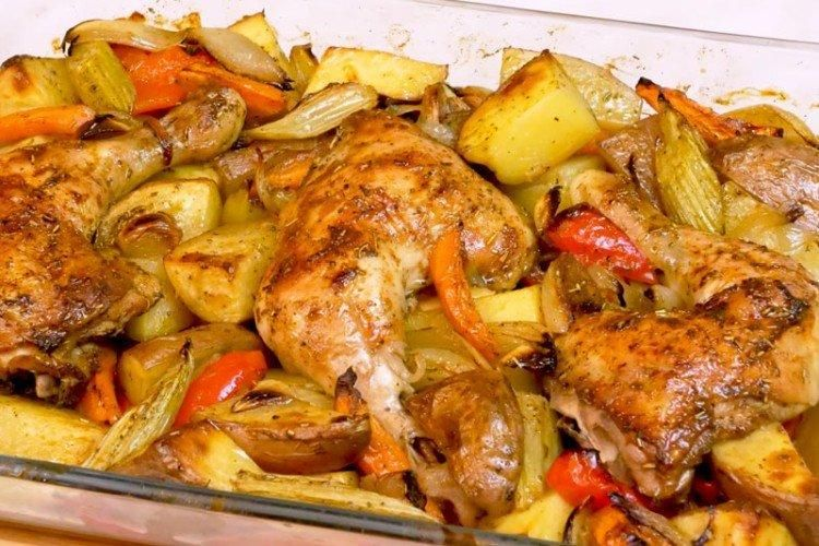 - Основное блюдо: запеченная курица с овощами.