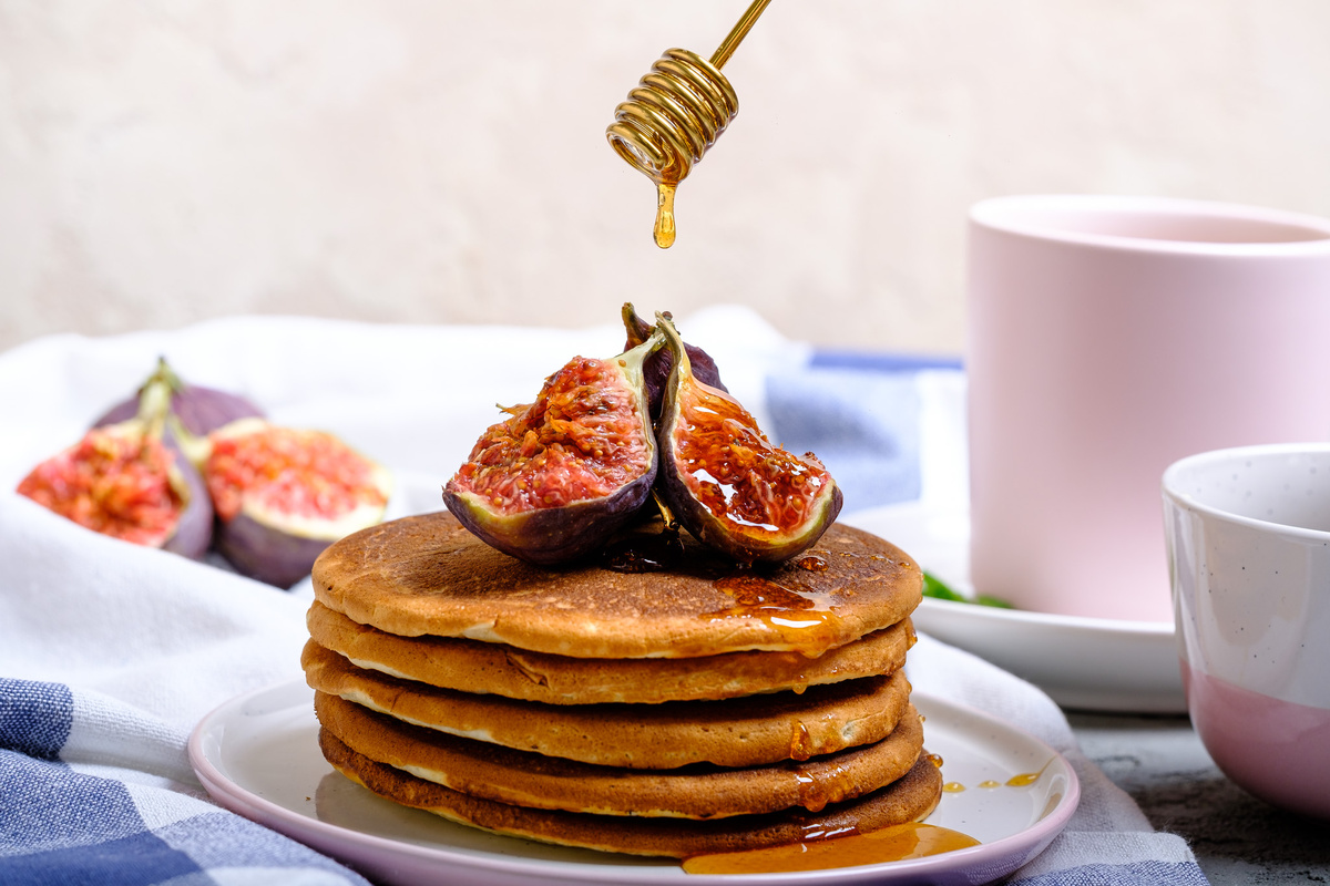 Пора наслаждаться инжиром! Этот восхитительный фрукт отлично сочетается как с десертами, так и с основными блюдами. В сочетании с панкейками он привносит свежие фруктовые нотки. Мёд и инжир делают сладость более выраженной, что особенно ценно, ведь в тесте используется минимальное количество сахара. Сегодня на повестке дня — приготовление сладких американских оладий, которые отличаются от традиционных тем, что их готовят в виде одного большого блинчика на сковороде без смазки.