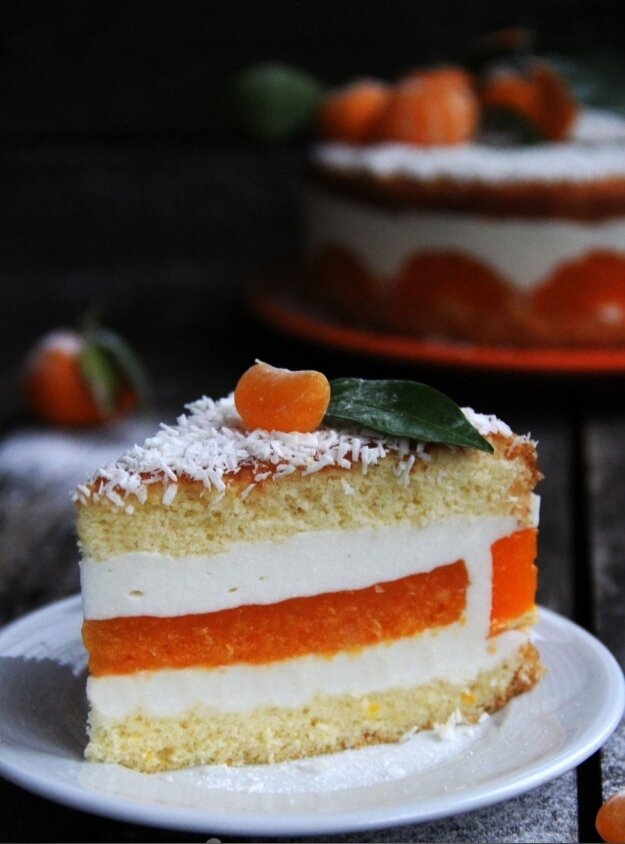 После сборки оставить торт в холодильнике на ночь. Перед подачей, аккуратно снять бортики формы и украсить кокосовой стружкой и дольками мандарина. Такой тортик обязательно удивит всех своим неповторимым вкусом и текстурой!