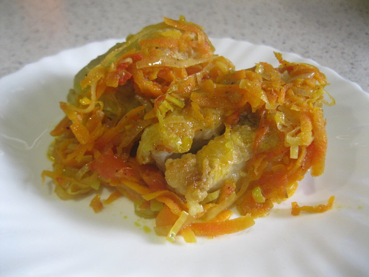 Кусочки рыбы помещаем в небольшую кастрюлю. Для овощной зажарки обжариваем лук-порей на сковороде, пока он не станет мягким, затем добавляем тертую морковь. Тушим около пяти минут, после чего добавляем нарезанные помидоры. Перемешиваем и готовим еще 2-3 минуты, чтобы овощи не потеряли свой сок. В этот момент не забудьте немного приправить зажарку солью и перцем.