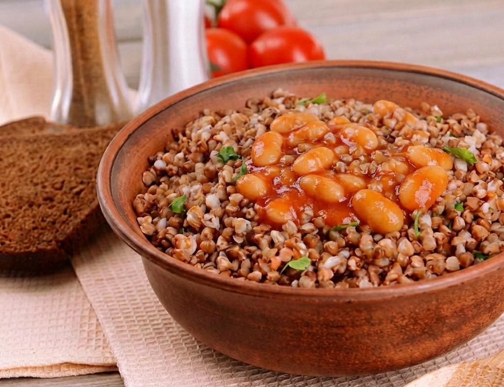 Это блюдо порадует тем, что готовится в одной форме. Достаточно лишь порезать одну луковицу и 300 г шампиньонов. В жаропрочной посуде насыпьте стакан гречки, добавьте нарезанные грибы, лук и ваши любимые специи. Залейте двумя стаканами воды, закройте крышкой или фольгой и запекайте при 180°C в течение 30–35 минут. За 5 минут до конца готовки добавьте половину банки фасоли в томатном соусе от «Пиканта». Также можно готовить это яство в порционных горшочках, немного изменив пропорции.