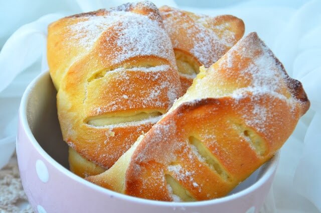 4. Выложите булочки на противень и дайте им подняться еще 30 минут. Перед выпечкой смазать желтком. Выпекайте при 180°C около 15 минут. Как только булочки подрумянятся, посыпьте их сахарной пудрой.