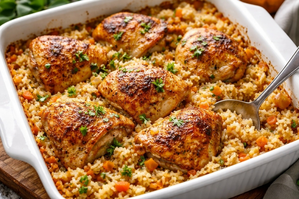 Секрет этого рецепта — в легкости. Готовить гарнир и обжаривать курицу отдельно не нужно, все собирается в одной форме и отправляется в духовку. Но важнее всего вкус: рис обогащается соками курицы и специями, становясь полноценным блюдом, а не простым гарниром.