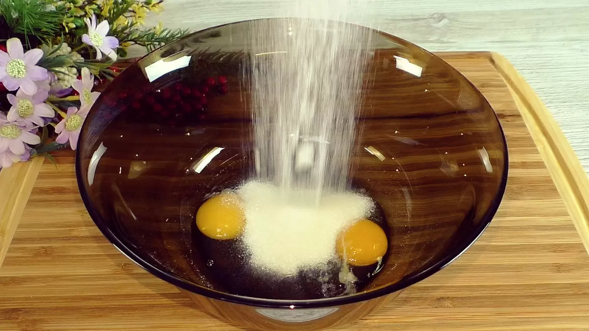 В глубокой миске смешиваются яйца, соль и сахар. Все это тщательно взбивается до однородного состояния. В этом рецепте не используется ванилин, но при желании его можно добавить.
