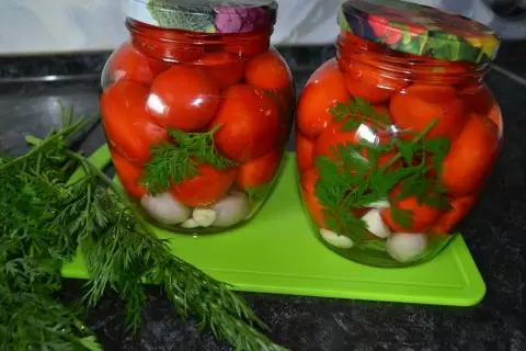 Для приготовления необходимо: тщательно вымыть помидоры, простерилизовать банки и укладывать специи на дно банки. Затем плотно уложить помидоры, залить горячим маринадом, и пройти стерилизацию в кипящей воде в течение 15 минут.