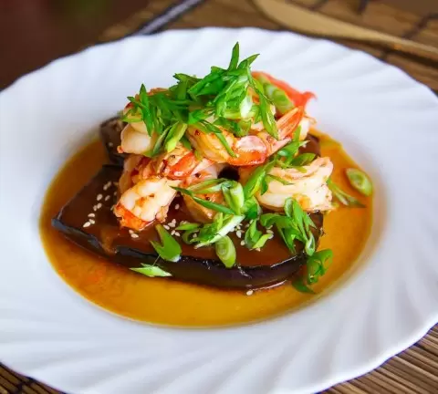 Для завершения блюда баклажаны выкладывают на тарелку, посыпают кунжутом и добавляют креветки с соком, который остался на сковороде. Сбрызнув всё комбинацией соевого соуса и лимонного сока, можно украсить зелёным луком. Это яркое и аппетитное блюдо будет прекрасно смотреться на белой посуде и станет настоящим украшением любого стола.