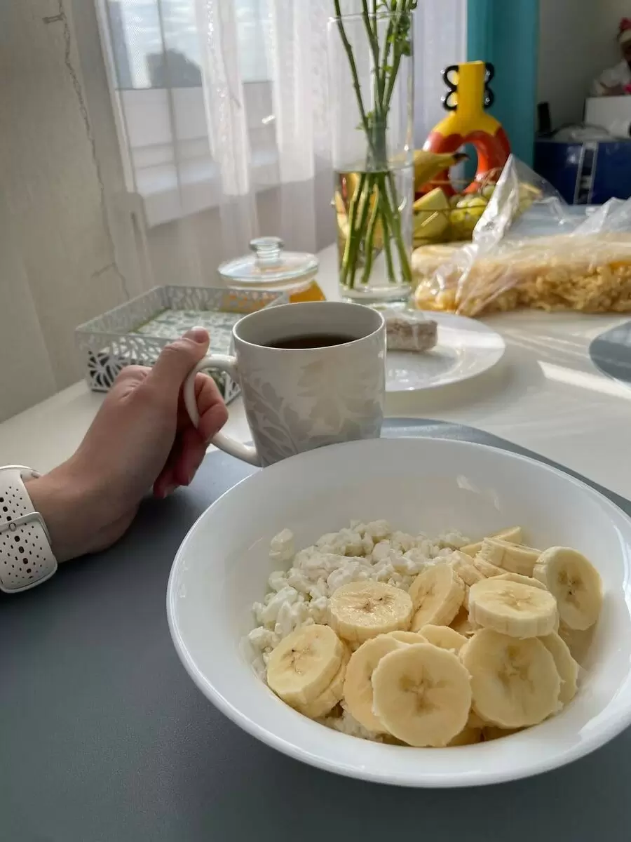Сегодняшний день приятно удивил своей яркой кулинарной программой. Начинался он с восхитительного завтрака: нежный творог, в компании спелого банана, обеспечил отличный старт. После этого, для поднятия настроения, был выпит стакан горячего какао.