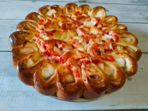 Тесто обминается и раскатывается в лепешку толщиной около 5 мм. На подготовленный пергамент выкладываются полоски рыбы, обвёрнутые в тесто, формируя бортик. Затем в середину помещаются рыбные кубики, сверху распределяются острые овощи, и всё это посыпается тертой моцареллой.
