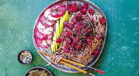 Лапша с маринованной свеклой, авокадо и редькой напоминает стильные поке боулы, популярные среди любителей здорового питания. Это яркое блюдо собирается из множества простых ингредиентов, иногда в необычных сочетаниях, создавая настоящий гастрономический шедевр.