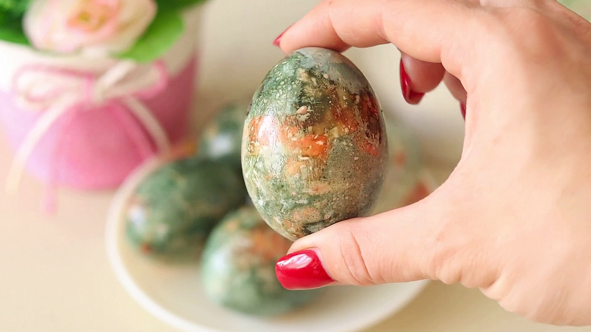 После варки аккуратно выньте яйца и снимите бинт с шелухой. Результат порадует: необычные цвета, а также возможность добавить в раствор немного зеленого пищевого красителя для дополнительного эффекта. Не забудьте протереть каждое яйцо ватным диском, смоченным в растительном масле для придания дополнительного блеска.