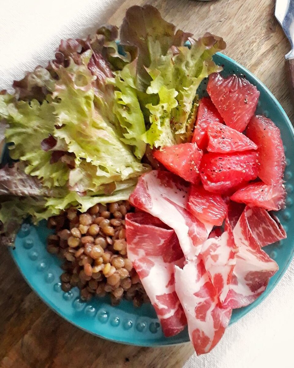 Салат станет идеальным вариантом для начинающего дня. Он содержит все необходимое для быстрого и полезного перекуса: растительный белок в виде чечевицы, качественный животный белок и натуральные жиры из ветчины, а также углеводы и клетчатку от свежего зелёного салата и грейпфрута.